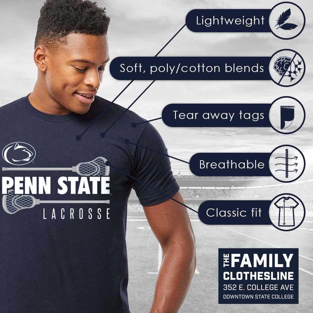Support your favorite team with this PSU lacrosse t-shirt. The Nittany Lion logo, the Penn State word mark, and "Lacrosse" have been printed on the front in between a graphic of two lacrosse sticks!